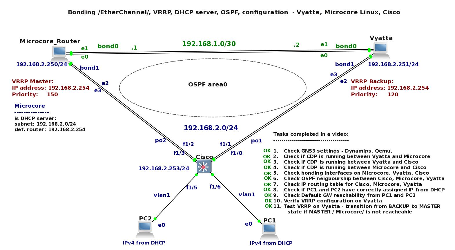 VRRP stands for Virtual Router Redundancy protocol. You can read more about VRRP on Wiki. I have showed some basic VRRP configuration on Vyatta and Microcore. Microcore Linux router is Master because its priority is 150 and higher than Vyatta's priority 120 therefore traffic from PC1 and PC2 will go through bond1 interface. If bond1 interface on Microcore fails, Vyatta will take responsibility for traffic forwarding and transit from Backup role to Master. This transitions is shown in point 11 of video.